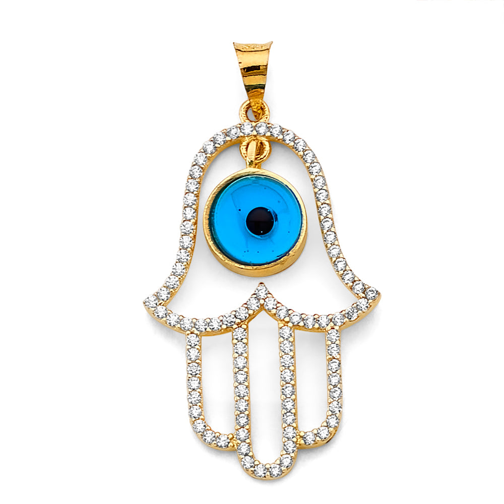 14K Two Tone Gold CZ Hamsa Hand With Evil Eye Pendant