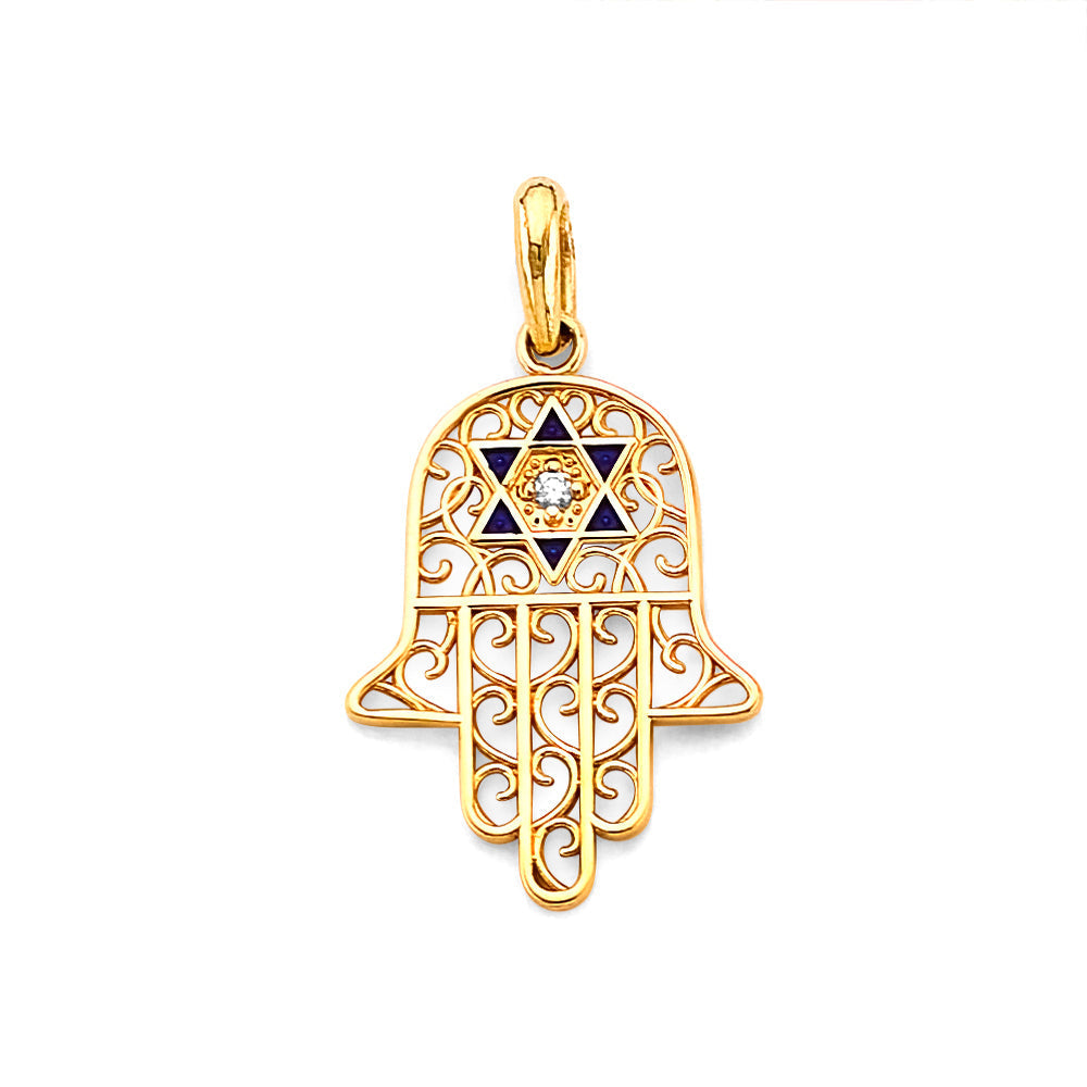 14K Yellow Gold CZ Enamel Hamsa Hand Pendant