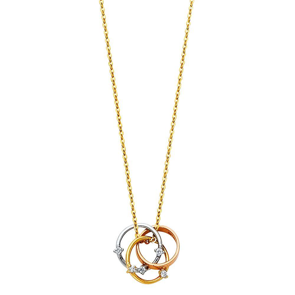 Wholesale 14K Tricolor Rings CZ Necklace Weight-1.87grams, Length-17+1inches, Height-12mm, Pendant Width-13mm, Chain Width-0.5mm