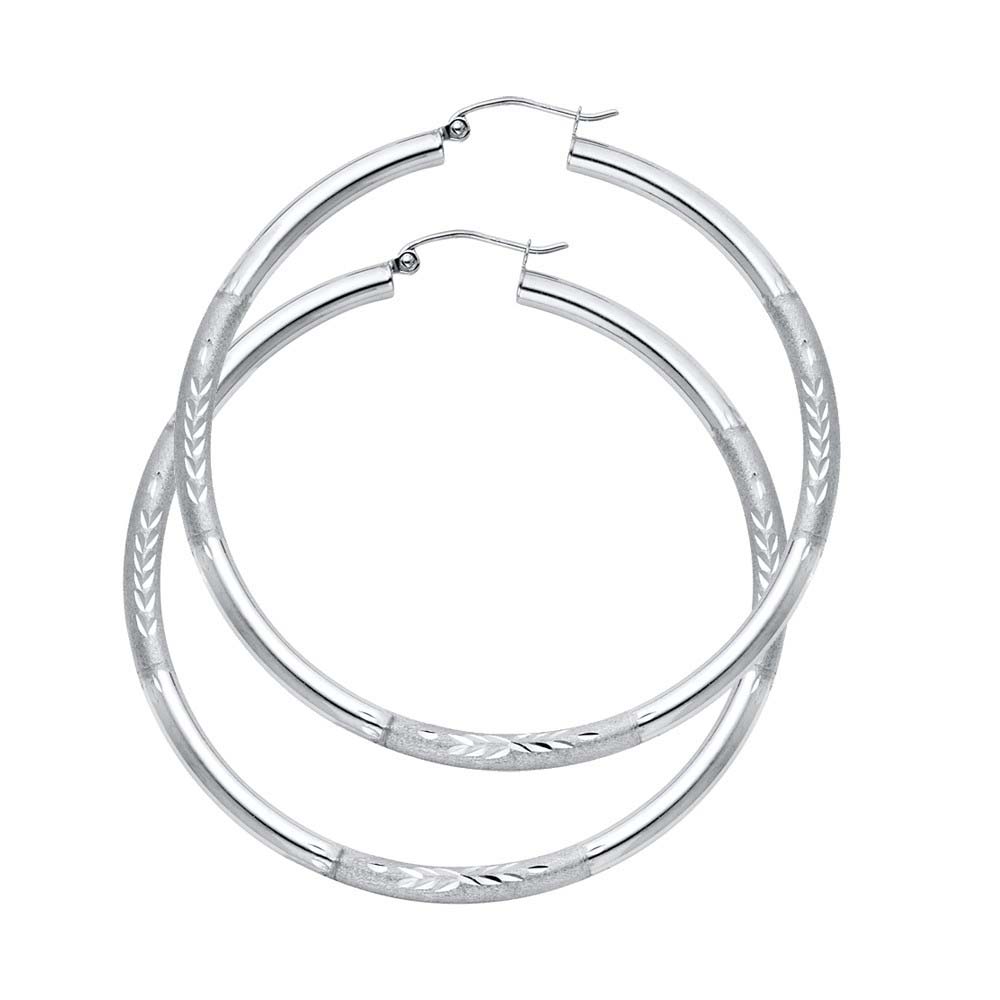 14K White Gold 3mm Large High Polished And Satin Diamond Cut Latch And Hinge-Notch Post Backing Hoop Earrings