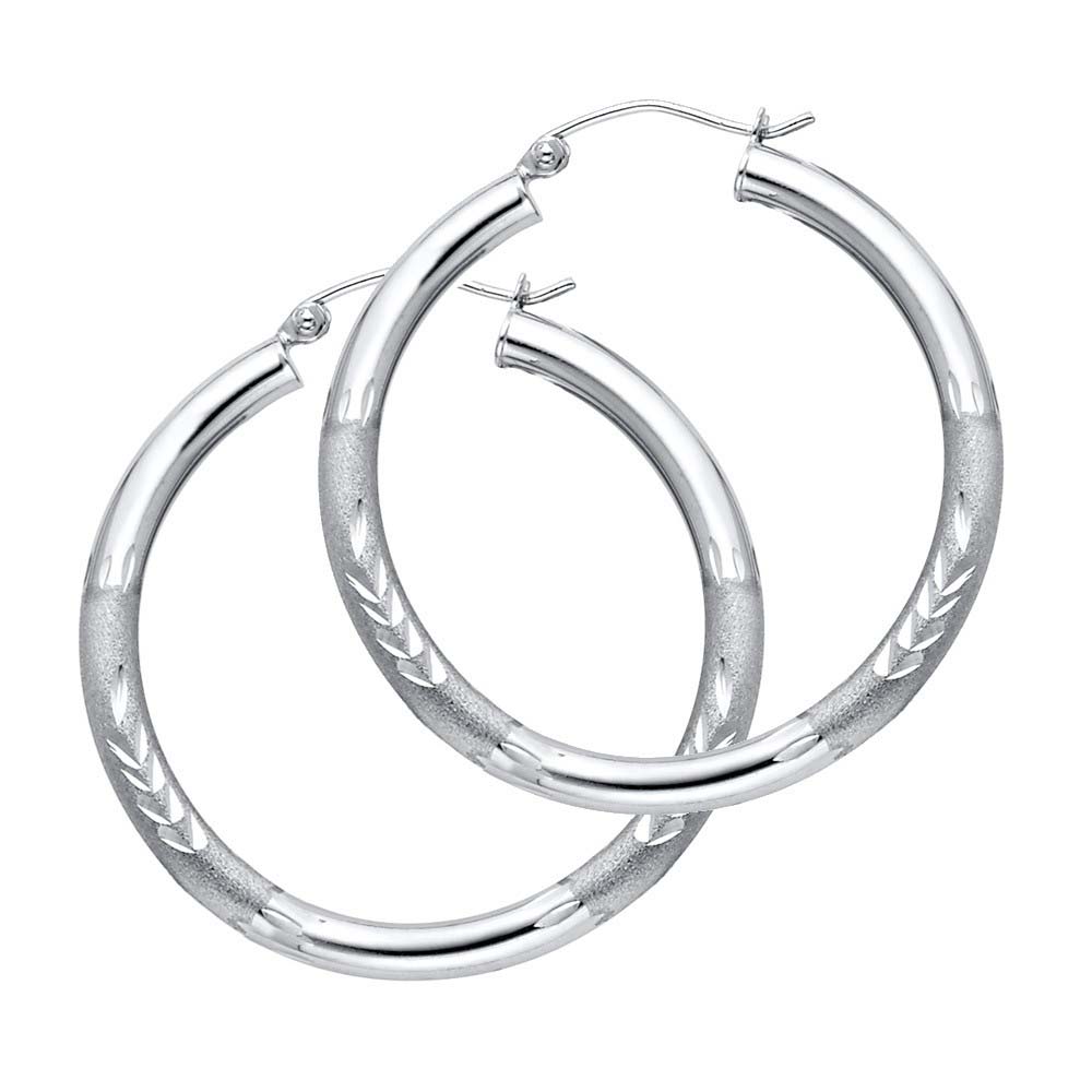 14K White Gold 3mm Medium High Polished And Satin Diamond Cut Latch And Hinge-Notch Post Backing Hoop Earrings